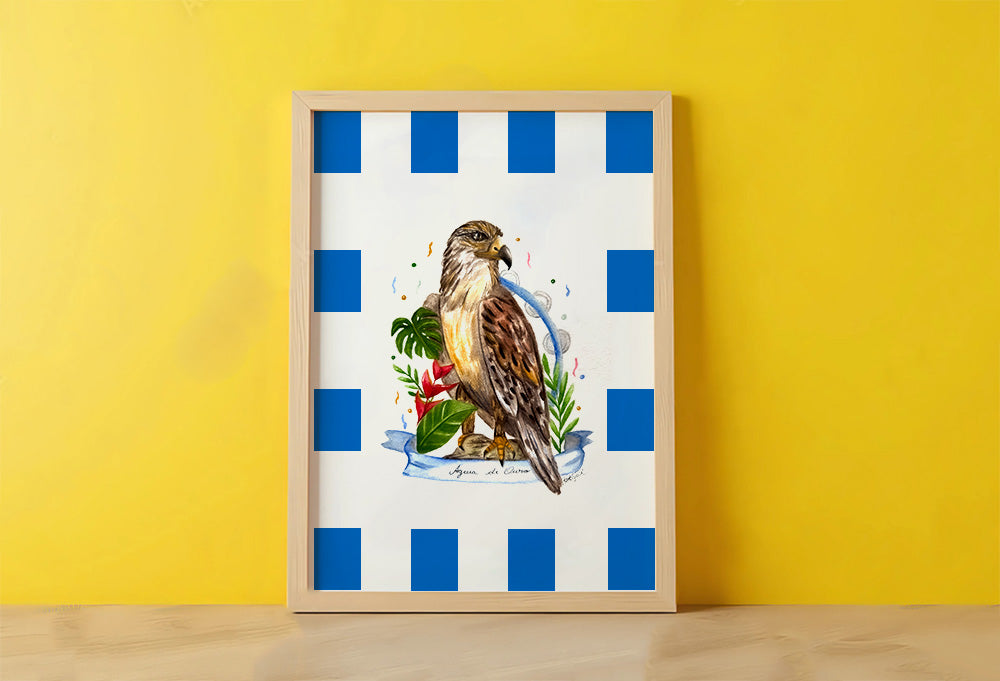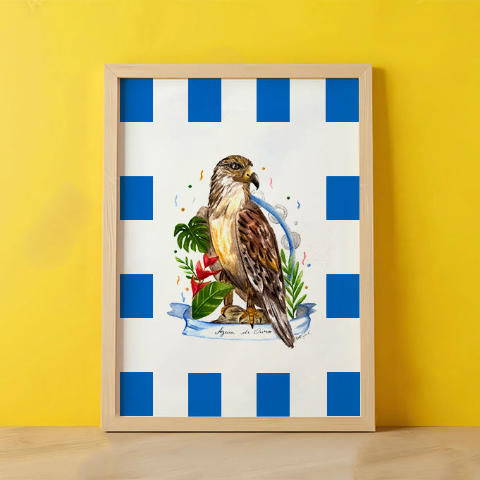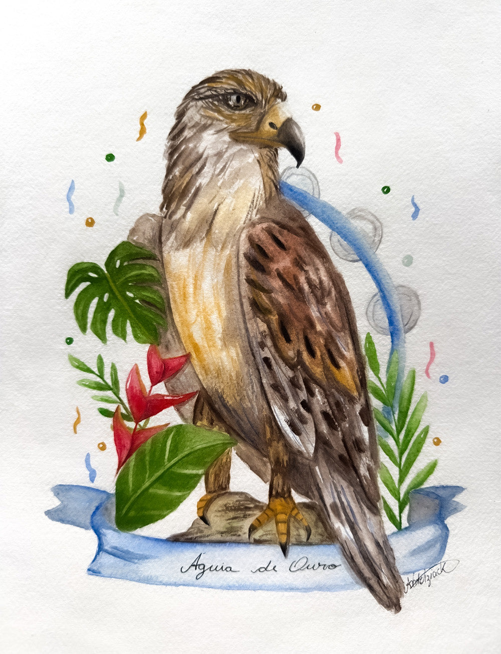 Águia de Ouro is a samba school in the city of São Paulo. The painting depicts the eagle representing the school and the pandeirola instrument symbolising samba.
